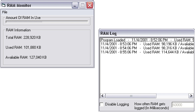This shows how much RAM you are using and how much you have left. It will also warn you if your almost out and it will log it. All the commands are optional and can be turned offand on in the program. You can also hide it and control it in the system tray.