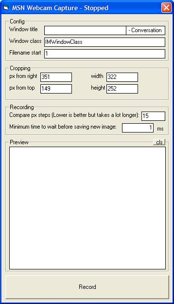 Captures a webcam from MSN / Windows Live Messenger (or any other app) and saves the image to the disk. You choose how big to make the result, and where to crop it. Will only save an image to the disk if it differs from the last image it saved (so you dont get tons of the same image saved). Code is not commented, and may be hard to follow. Sorry about that, I just thought I'd share it incase anyone is interested =]