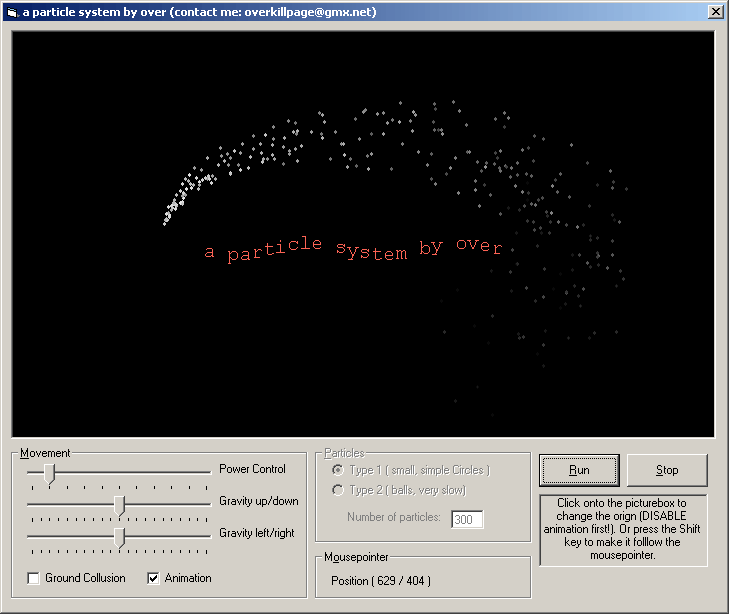 A particle system, done in pure VB. It shows how to create such an effect system. The program is not accelerated in any way and does not use DirectX or OpenGL. It just demonstrates the technique. It can be great fun to watch the animation and play arround with the gravity settings etc. ;)