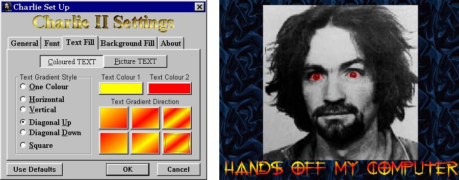 This is an almost complete re-write of my earlier "Talking" Charlie screen saver. This version is heavily documented, it will display in the Preveiw Pane of the Display Properties dialog and has a myriad of available settings to allow for colour gradients or user defined pictures in the text and backgrounds, as well as it's own Font selection dialog (Thanks to Rob Bogdanoff for the Fonts code).
