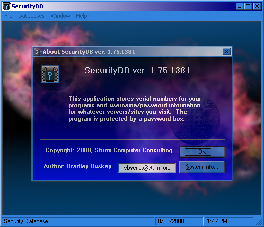 I have made this program much better. It will determine which version of windows you are running and allow different features to be used. In Win9x, it will grab the casched passwords, in 2000 it has transparent forms (some are), and in Nt 4, both Casched Passwords and transparency are turned off. It allows you to change your password to open the DB (starts as PASSWORD all lowercase) and allows you to put the database file i a new location and load it, or open a different database. I have included a search feature for both the Passwords and Serial numbers. I have written a help file project, and will distribute the finished help file in another zip with the runtime. Please leave me some comments.
