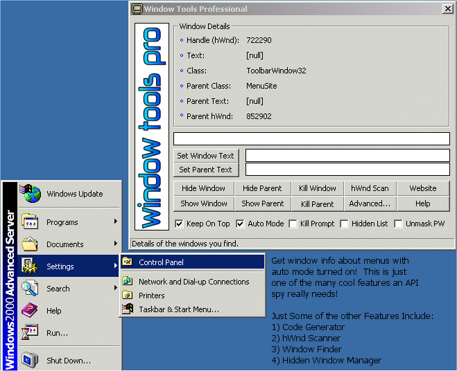 This is an Ultra API Spy (lots o' features). Some of the features include hWnd Scanner, Code Generator, Window Finder, and Hidden Window Manager - allows you to hide multiple windows [and get them back!] There is a Help.doc included to help you use it (if you need help). I'm sure you'll find this useful for your own VB (and even some C++!) programming (especially you AOL programmers). Please make sure to VOTE if you like it!