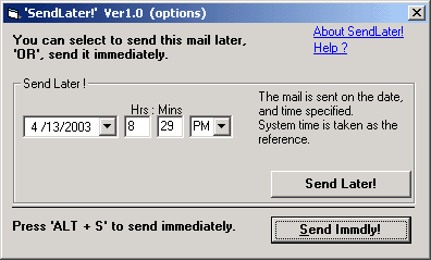 Send Later V1.0 is an 'Addin' for Microsoft Outlook to enable users of outlook to send mails at differed delivery times.