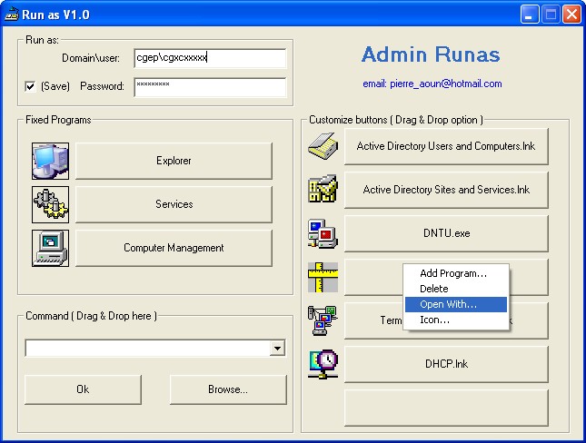 A simple Runas, You can run a program as any UserName you like, just drag & drop a program or browse destination. You can customize the icons too…