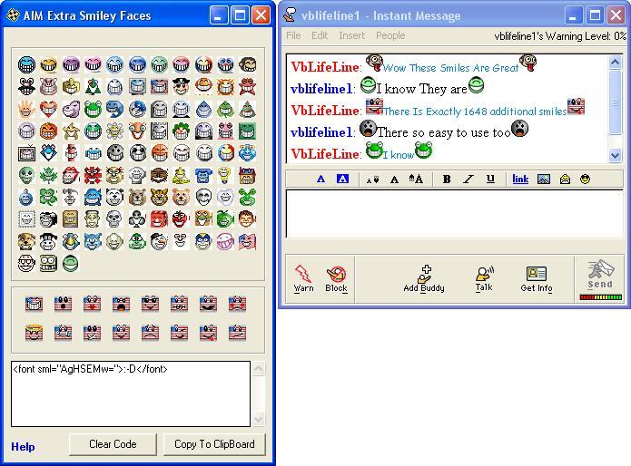 with this program you can Unlook secret Smiles on AIM 5.0 or higher and on AOl 8.0 or higher there are excatly 1648 additional smiles. In order for you to view these icons in your istant message you and your freind both hve to be running AIM 5.0 or higher or AOL 8.0 or higher please vot for my submission i worked hard on it