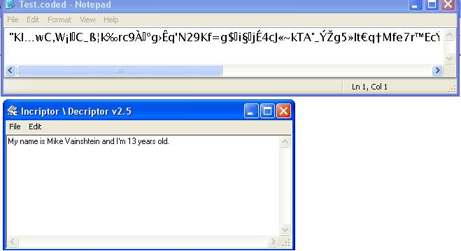 Transforms each letter into another according to the ascii code. betwen each transformed letter, random characters are added. The file has an extantion of .coded ----- Thats all.