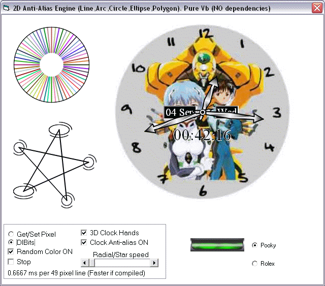 2D Anti-Alias Engine *UPDATE* (Line,Arc,Circle,Ellipse,Polygon). Pure Vb (NO dependencies). Unlike most other engines this draws smooth objects without the jaggies. Superior quality of antialiased lines is achieved by adding a blended line to both sides of the original. 3D clock hands made with 2D rotating polygons and triangular gradient fills to simulate lighting/shading. All wrapped up in a simple to use class.