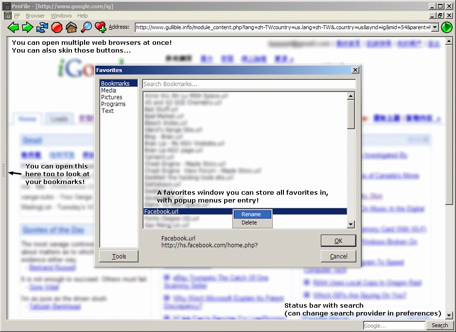Extremely versatile open source project. Does not run when any OCX is missing because Im not using any, yet this program is able to open all media files your media player can, text files, images, web browser and more. Extensive INI interface with editor (called preferences), as well as multiple backing tools, skinning, event audio feedback (e.g. when you open a new window, a chime will sound)... Update Aug 15: Added lots of features, including "Virtual ListView" without ListView control.