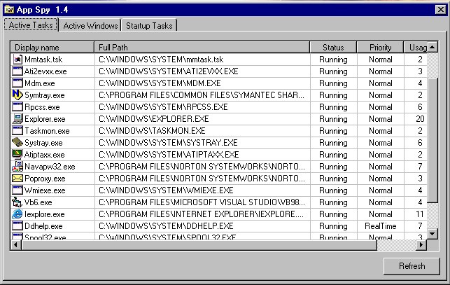 This is a combination of three programs found here on VBC. It enumerates active programs and their windows. I left in the original Startup programs list. I did add a few extras of my own, although, it is mostly based upon App Spy by some bloke. The orginal App Spy was here last month but not any more so I do not know who to give credit to...