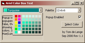 A popup color selector active-x control, similar to a combobox, featuring 12 different palettes, and 2 color selection events: Click() and Change(). The popup window can be disabled, in which case the popup()event may be used to substitute your own color selection code, or access to the common windows dialog. Hue selection is done