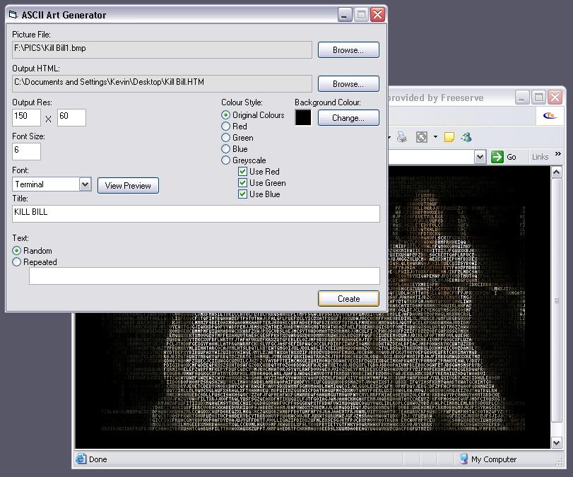 This program will take a picture and convert it to ASCII art, so that it can be shown in a html page. When converting a picture you can adjust what dimensions of the output you want, what size and font to use, you can alter the colouring and also the text that is used to render the picture. Included is an example of what a generated picture will look like.