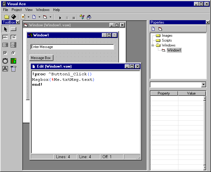 Ace Scripting Language is a my attempt to create a computer language. It's bundled with an IDE called Visual Ace which includes a dialog editor(window editor), a code editor and a ton of other things. The script functions and commands are fully documented in the IDE via the code browser and it will 'compile' to an executable. An example project is included.