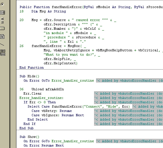 This code automatically adds centralized error trapping to your code. It reads an .ini file that it stores in the same folder as your project that contains two pieces of code. One is inserted into the top of every method and one is inserted in the bottom. This can be used as a last line of defense against unexpected errors. The default is to allow the user to Abort/Retry/Ignore the error instead of just crashing the program. It will also (optionally) automatically insert line number into your code so that you can use vb's Erl function to get the exact line number where your error occurred.