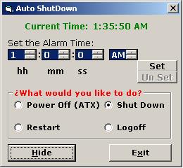 This code.. let you set the time.. and at that certain time this code will shutdown / restart / logoff your computer as you select it from options.. also it will tell you how to add systray icon.. well commented..