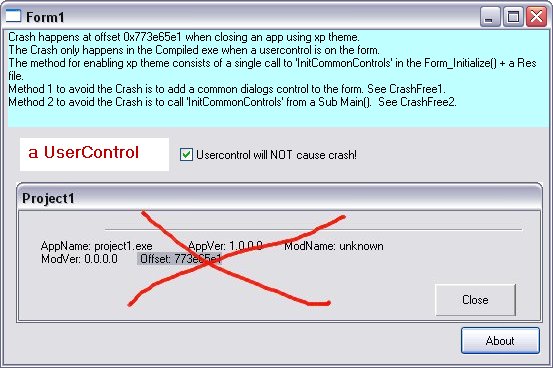 Study of why vb6 applications with xp theme enabled sometimes crashes when closed. I have included an example of an application that crashed and two examples to show how to prevent it from crashing. Conclusions: It seems to be related to XP Theme not being closed correctly when an internal vb6 UserControl is placed on the main form.