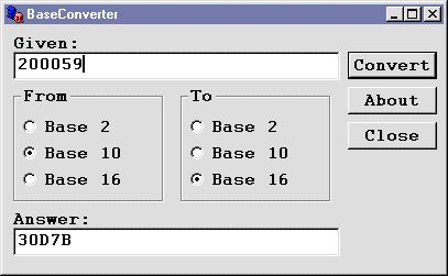 This application converts numbers from one base to another. Namely binary, decimal and hexadecimal numbers.