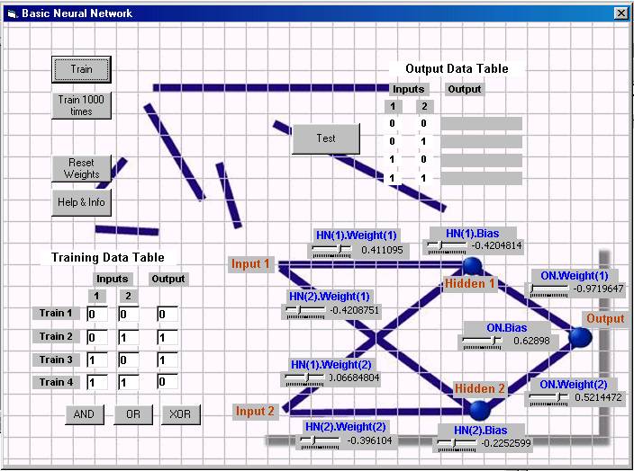 This is a Basic Neural Net, based on original code by Richard Gardner. This is designed as a learning program, to help in the process of learning and understanding the basics of coding neurons and neural networks. I've taken Richard's code, changed it around a bit to make the neuron data a bit more readable, and commented the code to explain whats going on at every stage. The program uses backwards propogation (or back prop) to train the network. There is a basic data structure for a neuron that stores all the information about the neuron and associated weights, and the code (Richard's, mainly) is broken down into parts that allow you to clearly see code for training, activation of a neuron, and getting an output from the network. There's a nice GUI stuck on the front of it all, which gives you a graphical representation of how the neurons are layed out in my code (its a static graphic). As it is at the moment, it makes for quite a nice tutorial program if you just want to compile it and watch it train for the preset functions, or enter your own input data and train it for that. Basic neural net knowledge is assumed (you should really know what a neuron is, and have some idea of what training a neural network to do functions like AND or XOR actually means, otherwise the GUI won't mean much from the outset). I'm still really only a neural net learner, so I don't make any guarantee that this is completely accurate or complete in anyway. Hopefully the code is written so that you can expand on it to make different neural configurations if you want to. I don't mind what you do with any of this program, or code, but would be interested to hear comments and/or suggestions.