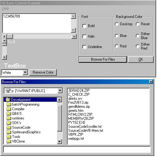 Getting back to the basics of using VB6 controls. Included in the project are, checkboxes, options, combobox, textbox, Scroll bars, File list, Dir list, and drive list. Very simple programming intended for beginners. Has an example of browsing for files without using common dialog control. Plus an example of using the ShellExecute api and 2 option dithered background.