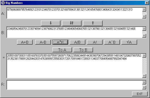 Perform big integer calculations (now up to 80000 digits, but can use more). Implemented are +, -, *, /, !, power and square root. Use integer calculations, so it is faster than string calculations programs.
