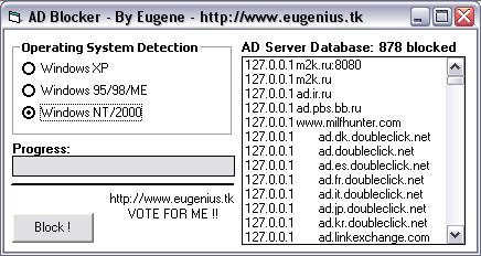 Block WEB Advertisements before they are even downloaded, you can save all your precious BANDWIDTH or just stop being bothered by all those AD's on web pages ! Just download and take a look, test it and VOTE FOR ME !!