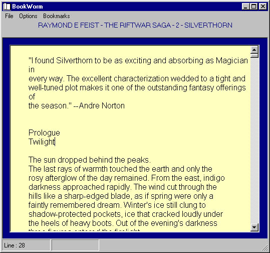 Download BookWorm Electronic Book Viewer with bookmarks, Color changes for easy on the eys reading. (296 KB)