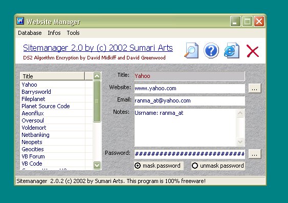 ...for storing your websites,emails and passwords. High security: connect to an user/password restricted ms access 2000 ado-jet database.Bulletproof: Store all your passwords ONLY in their encrypted hex value. Please check the 2 textfiles for more infos about the encryption used (Buisness strength) and the database.