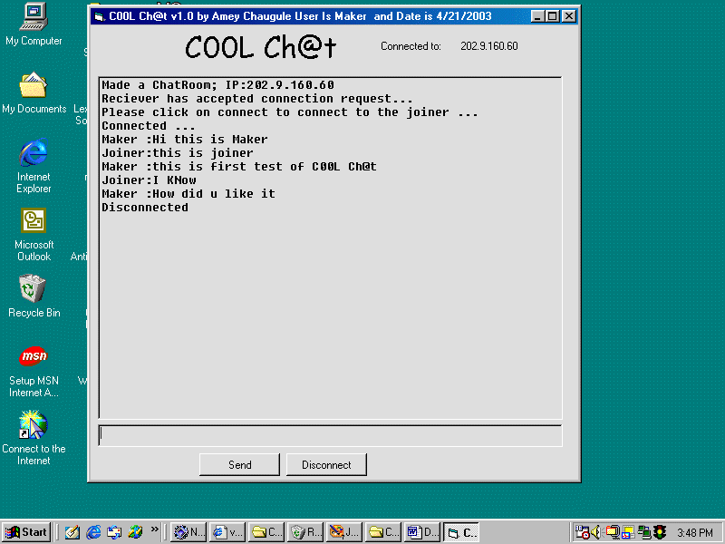 A Basic Chat Program written in extremely clean and reader friendly code. Good for the newbies to Socket programming. 2 ppl can use this program in a chat room at a particualr time . This program can also be run from a single computer by running 2 copies simultaneously.
