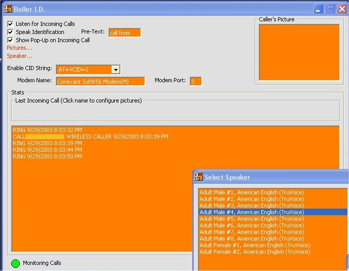 This is everything you could ask for in a caller id program. This will monitor your incoming calls and display them if you have caller id and if your modem supports caller id. You can select a picture for the person calling. This will also speak if desired when a person calls and save all your calls. You will need the text-to-speech engine which you can get from https://www.microsoft.com/msagent/downloads/user.asp#tts. I've seen things way worse than this cost alot of money, so take advantage of this source. This is just a beta version. Most things have been tested. Please send any of your feedback or information to improve this source to [email protected] or pm me on AIM: kescalade1