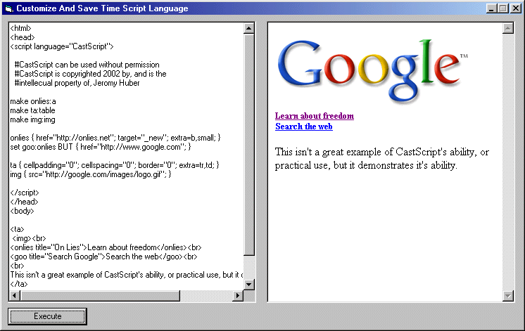 The Customize And Save Time Scripting language is used along the same lines as JavaScript; it is embedded in the HTML code. The script defines tags and their properties, then implants them into the HTML source via the tags' name. I was constantly getting tired of continually writing and and re-writing the same lines of code in HTML; and I wondered how I could use a scripting language to define tags that could be reused over and over again. CastScript is what I came up with.