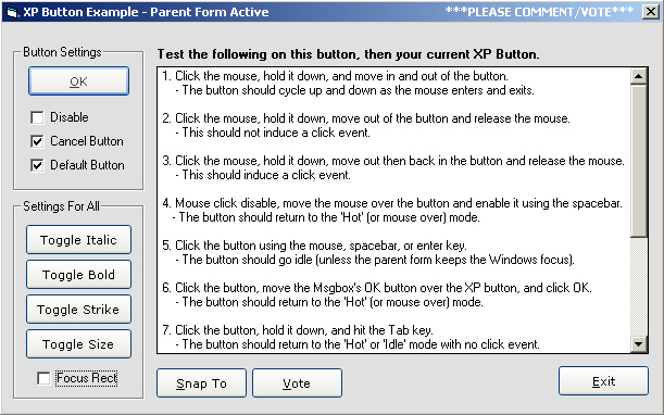 Has Cancel, Default, Mouse Snap To, and AccessKey features. Draws optional focus rect. Win 98 and up compatible. Parent Windows active state aware; raises active state event when parent form is activated or deactivated (as the Windows topmost window). This function is useful for redrawing custom title bars. My goal with this button is simply to create an efficient and reliable XPButton that is appropriate for 99% of the apps I write, a single line button without all the overhead of multiple visual styles. I painstakingly tested this control to ensure it never draws twice unnecessarily, or freaks when the user doesn't release the mouse button when expected. If all you want is an efficient original style XP button that works solid, this one may be for you. Its functionality may also provide a workable shell for developing other custom buttons. Please comment/rate/report bugs, I appreciate your input.
