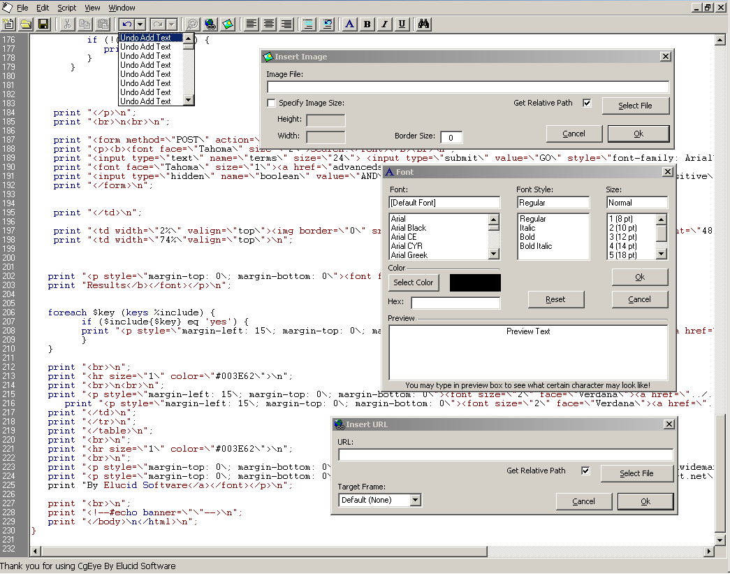 Lets you edit, look at, and much more with cgi scripts. Numbers the lines on the right, highlights the code and even as you type, uses ZER0 OCX's and much much more. Also shows you how to do a lot of stuff involving a text editor or script editor. Saves all your settings and uses intuitive non-ocx interfaces throughout. As well as using common dialog's with api, unlimited undo , complex string manipulation, and much more.