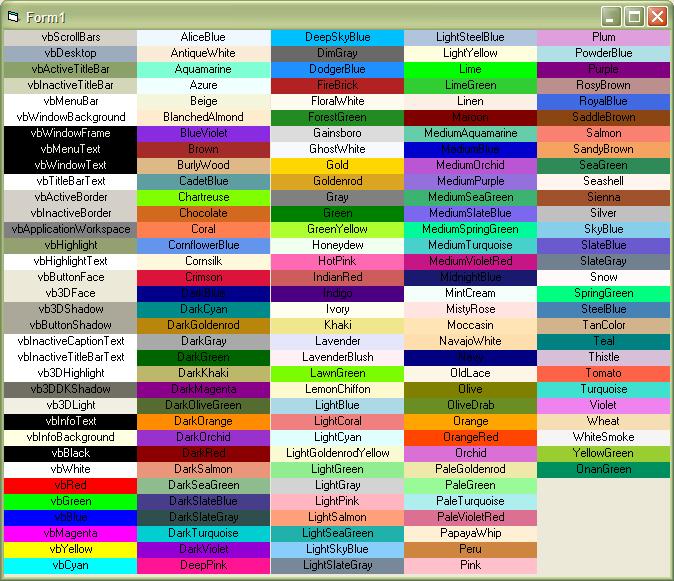 Most people know about and use VB's color constants. Most people that I know think green and yellow are a little too bright. Did you know that you can override and change the colors to what you want them to be? Using this technique you can also add your own predfined colors. I have added all of the constants defined in LaVolpe's color picker to show you just some of the possibilities.