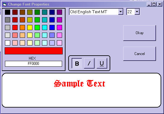 This is a total remake of my earlier submission. It lets you change your font properties within your app. Hope someone finds a use for it. Real simple code.