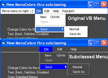 Change all Menucolors (Text, Background, Selection and Selected Text) thru subclassing. Still use VB Menus like allways no extra coding needed. popups are possible. only 16k bigger EXE.