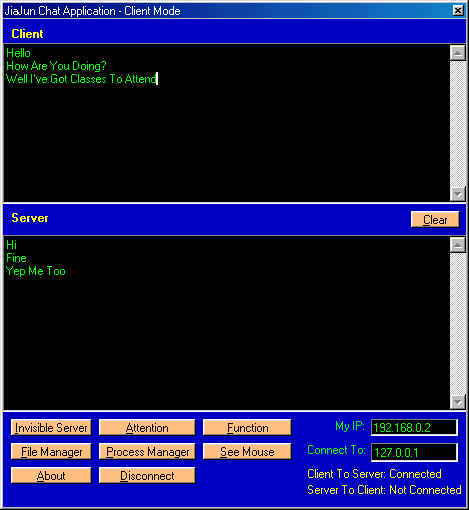A Fun Chat Program With Multiple Functons. See it out for yourself. Please Give Me A Good Vote.