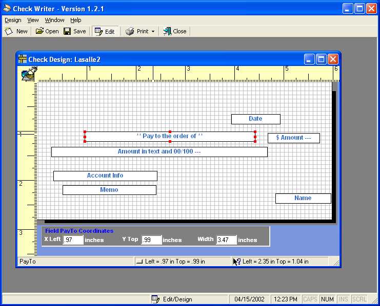 Since each check is slightly different there is a designer that will allow you to move the fields around using point and click (drag and drop) or key in the position (in inches) of a preset fields.