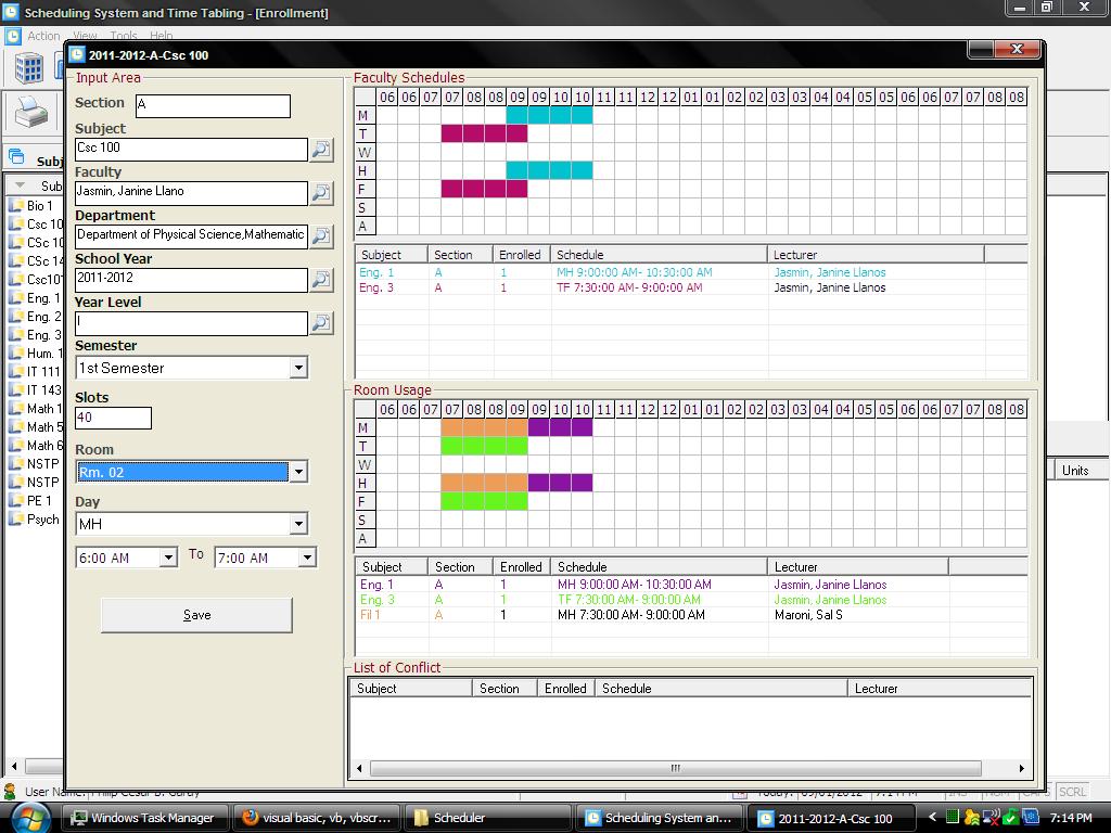 I would like to share here my Scheduling System, this system is only a part of my High School Enrollment System and my College Enrollment System that consist of 8 modules(registrar,grader,controller,scheduler,checker/assessor, collector/cashier,administrator, and the Web Transcript).