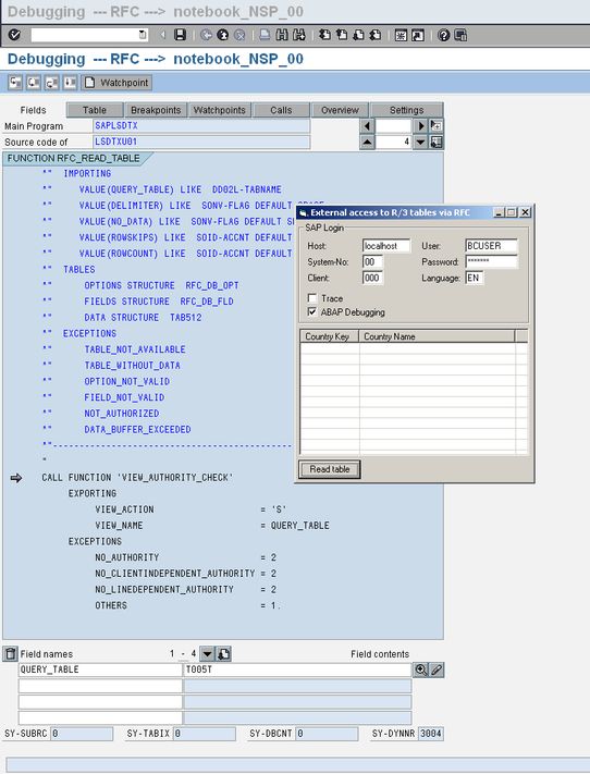 The example application shows how to read the countries from table T005T with the standard function module RFC_READ_TABLE.