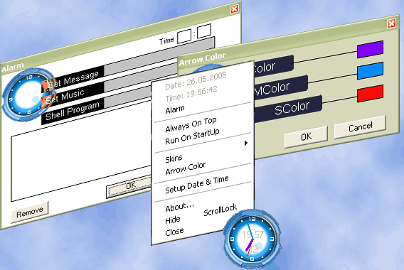 This is the clock with alarm and with nice design,Also you can change options so that every time when your computer will be turned on program will automaticly run. Also program will remember his coordinates on desktop.