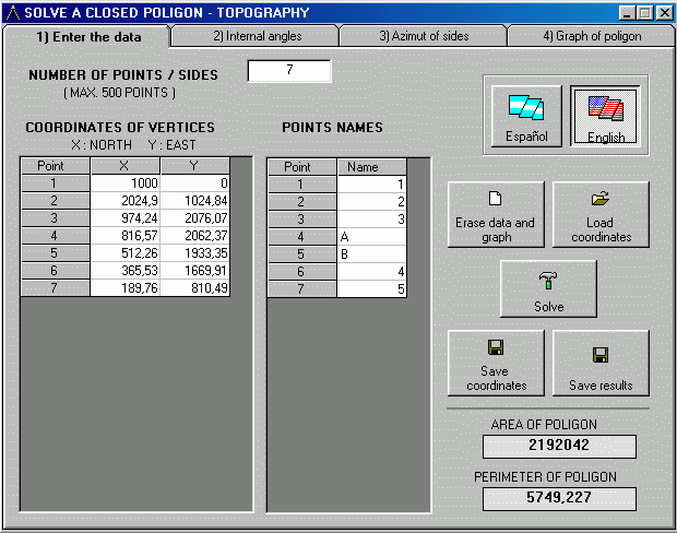 area , perimeter , graph (zoom , move , save ) , internal angles , azimuth of the sides , lenght of sides