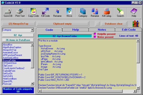 Want to rename a code ? Want to move a code to a different category ? Want to delete a code ? Want to add a help-file ? Want to add some notes to a code ? Want to EDIT a code ? Want to print the code ? Want to print the helpfile ? Want to ... As you can see, this is a fully working program that I use a lot when I'm coding. The CodeLib V2 (zip) is about 223 kb, but it has it all: the source, CodeLibV2.exe, data (about 70 different codes, all tested and working fine). I hope