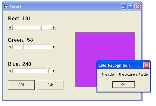 color of a picture box to reflect the value of the Red, Green and Blue scroll bars and indicate in a message box what the color it is: A shade of blue, purple, orange etc...