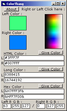 Click in the picture box, gives the color, and gives you the HTML color, Hex Color, and RGB color values for that color.