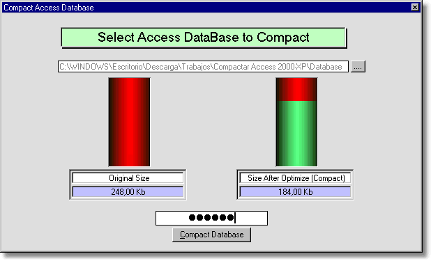 CompactDB App.Path & "\Datos.mdb", True, "Joselo.11·#" 'compact