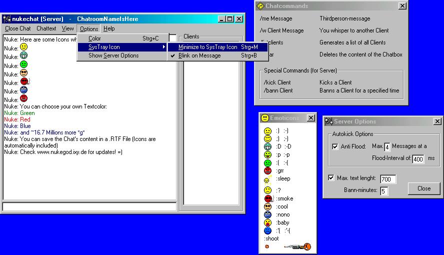 It's a really good Chat programm for both using in LAN and Internet. The Programm looks automatically for Chatrooms in your whole LAN, so you don't have to insert any IPs. Just click on "Get Internet Chatrooms" and you will receive a list of all open chatrooms in the entire internet. ":) ;)" and over 45 other Smileys will be automatically turned into little grafics. As a Chatroom Server, you can Kick or Bann other Users for a specified time if necessary. Of course all the chatters can have their own Textcolor they want(chosen from the windows-color palette). And the chat has got a nice feature: You can minimize the Chat into a SysTray-Icon (e.g. when the Manager walks into your Office :). You can choose if the Icon starts to blink when a message arrives. I also added a "Doskey" feature, so you can access all you typed messages with the Up- Down- Keys. There still are some other little features, which I don't want to list here, because it would take too much place :)