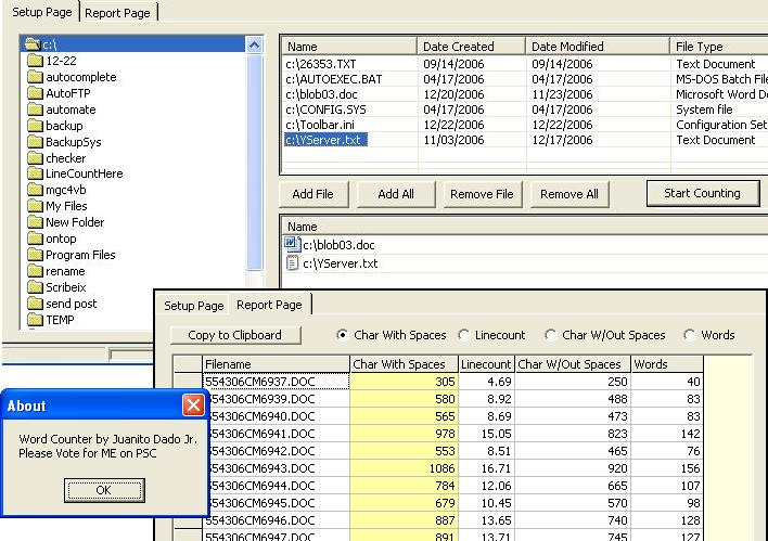 This is a complete word counter that counts ANY FORMAT like word, excel, txt, csv, xls etc. It counts for Char with or without spaces, word count and linecount. It pretty easy and it counts without the use of Split() function. It uses the word object from the microsoft word 11.0 object library so need referencing. I haven't included exporting but you can at least copy to the line count. The good thing with this one, is that you can simultaneously count up to 500 files plus. I really don't know the maximum limit but it'll depend on the system memory i think. This is good for the transcriptionist industry. Hope this helps to some!!! If you have any suggestions on how I can improve this, just let me know.