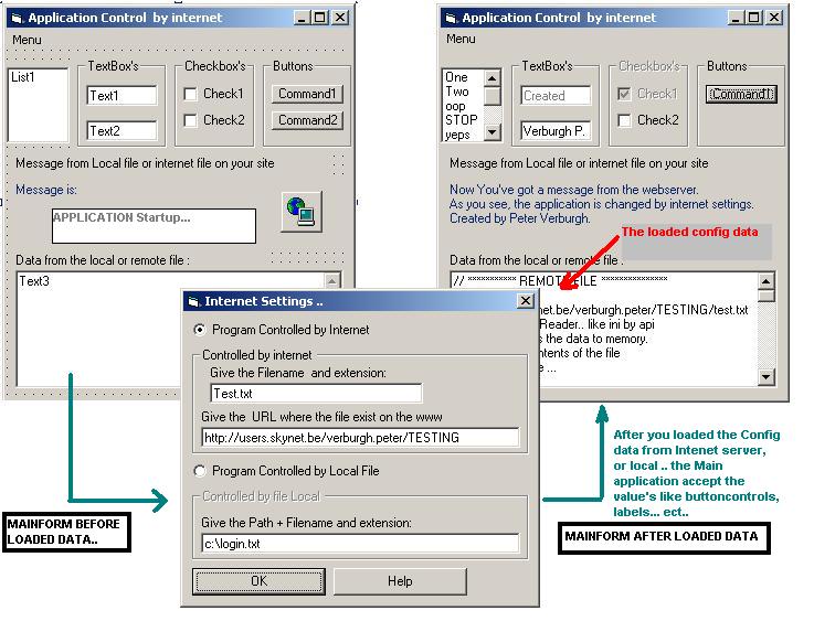 example, you start this program & the application will go to your site , downloads a file (config file) & then change the behavior of the application as my example , hidding buttons, changing a text label on the form , disabling checkbox's.. ect...