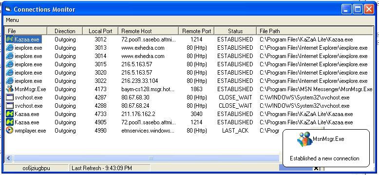 Shows all active connections with respective programs along with their 'actual' icons, shows status and remote address (IP) that connection is been made. Comes with a neat popup of new connections made (check screen shot). i owe credit for some parts of the code to others; Ariel icon extractor and CyberAlert (thanks Guys).