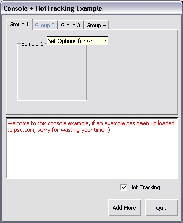 This example will show you how to make tabstrips use the "HotTracking" mode, and how to use a console richtextbox wise, eg: insert text with colour.