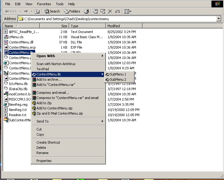 This adds a menu item to the context menu that you see when you right click on a file in explorer, just like winzip. I did not write all of this code. Jolyon Bloomfield (https://www.vbcoders.com/vb/scripts/ShowCode.asp?txtCodeId=12137&lngWId=1) did most of it, but I need some extra functionality, such as submenus. Like the way the new winzip does. I hope you can use this code.